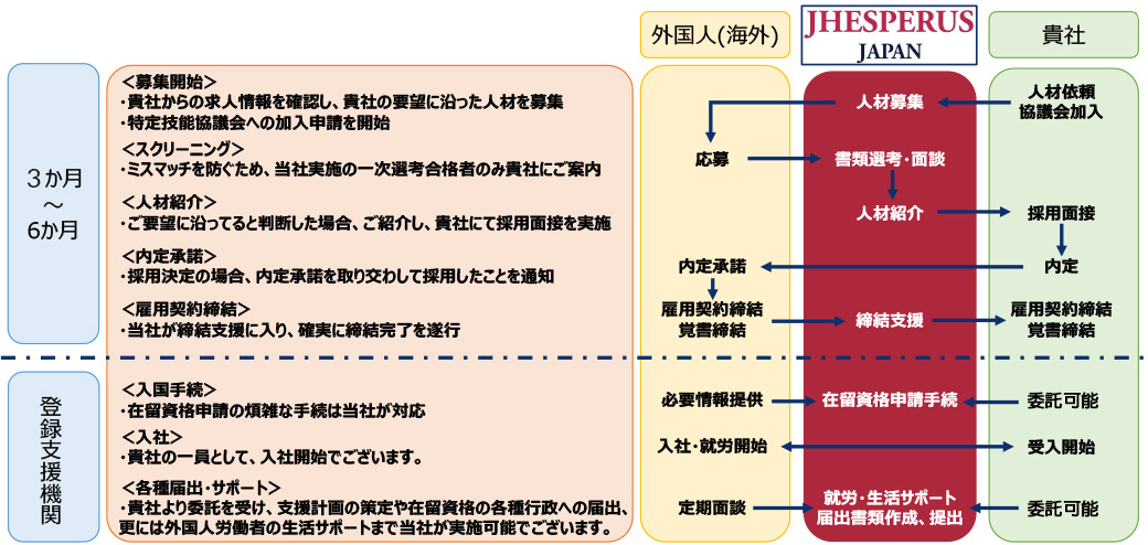 募集人財の発掘から入社前、そして入社後の支援(労働環境・社内対応・コミュニケーション等) 煩雑な在留資格申請から入社手続内容の確認まで一気通貫で提供