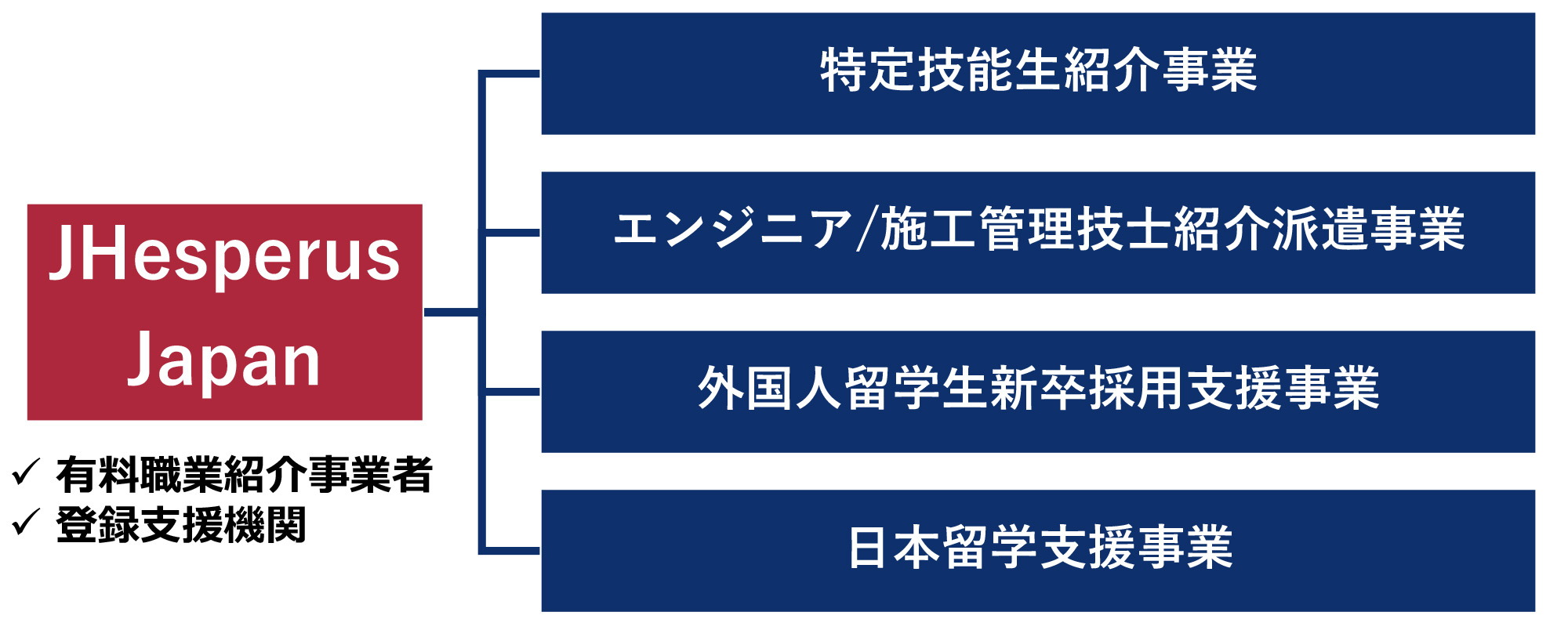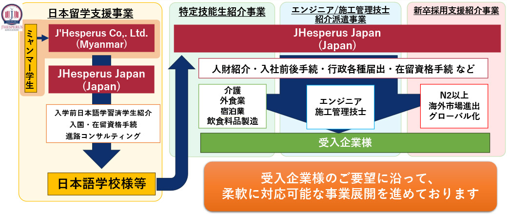 ⽇本のIT・製造や建設業界の企業様に対 し、海外を含む幅広いネットワークから、 ⾼度なスキルを持つミャンマー⼈エンジニ アや施⼯管理者を紹介します。 ビザ申請から⼊社後のサポートまで、ワン ストップで提供することで、企業様の採⽤ 業務の負担を軽減し、迅速な⼈材確保を⽀ 援します。