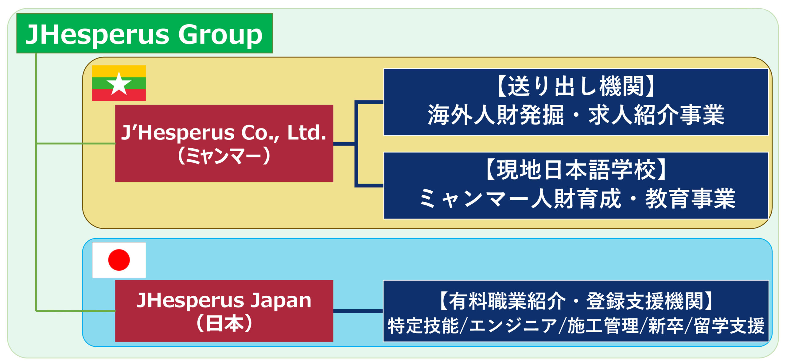 自然体では労働力人口や就業者数が毎年50万人規模で減少していくと見込まれる日本では、2030年には労働需要に対する人手不足が644万人とも予測されています。一方、2022年時点で総人口5418万人、平均年齢27歳と若いミャンマーは、生産年齢人口(15~64歳)が約66%を占め、豊富な人材ポテンシャルを有しています。2021年のクーデター以降、多くのミャンマー若者が海外への留学や就職を志すようになり、日本は大きなチャンスの地として注目されています。ミャンマー国内では日本語学習者が2倍以上に増加するなど、日本への関心が高まっています。JHesperus Japanは、こうした状況を踏まえ、日本の人手不足解消とミャンマー若者の未来を切り開く事業に取り組んでいます。